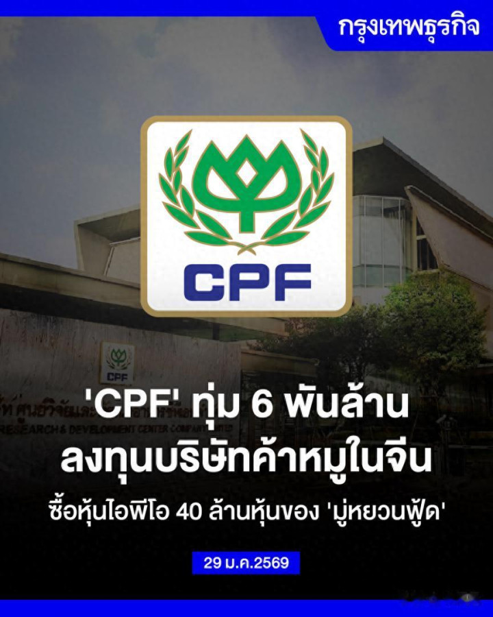泰国头条新闻社讯 1月29日,据泰媒报道,正大食品有限公司秘书柯布向泰国证券交易所报告,公司已以特定基石投资者身份,投资中国上市公司牧原食品首次公开发行(IPO)H股,共认购4000万股,投资金额约2亿美元,折合约62亿泰铢。